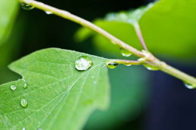 Last weekend was wet and chilly, but that made for a good opportunity to see some great rain driplets. I walked to the store in the rain, when it was just raining lightly, and noticed all the little round beads of water resting on leaves and flowers. They were so pretty that I decided to go home and head back out with our macro lens to get up close and personal with them. Macro lenses are so fun! Probably what I like most about photography is that you often see things you wouldn't normally notice, or you see them in a different way than what you're used to. To me, it's sort of like realizing interesting subtleties of a new language. I don't really know any other languages, but I know enough to know that certain words and structures of sentences have different nuances, subtle differences here and there that reveal something new, something you may not have known or noticed before about a particular word or phrase in your own language. At one point I was hunched over, down low on my knees, trying to get this first picture of the flower petal. A man stopped and said, "are you OK?" He didn't see my camera at first and was concerned that I was hurt! I told him I was okay and that I was trying to get a picture of the water on the petal, a petal that probably would have gone completely unnoticed to me had I not thought of it in pictures, my new language I'm learning. (And yes, I meant to call them driplets and not droplets just because I prefer the way it sounds.)